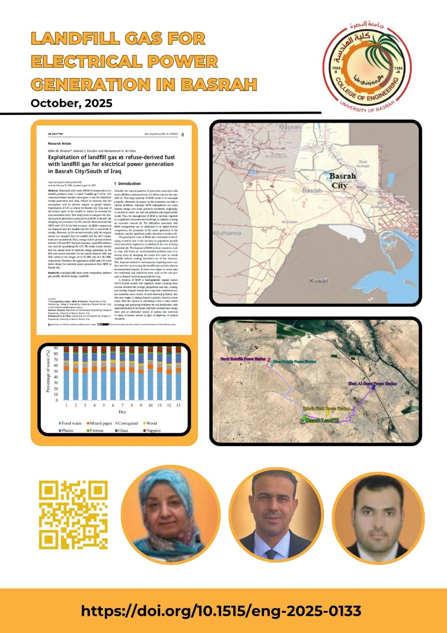 In a significant scientific achievement that reflects the research progress at the University of Basrah, a distinguished scientific paper by professors from the Department of Civil Engineering at the College of Engineering at the University of Basrah—Dr. Kifah Muhammad Khudair, Dr. Ahmed Sakban Khudair, and Dr. Muhammad Hamid Subhan—was published in the Open Engineering journal, published by the German publishing house De Gruyter. The journal is an international peer-reviewed journal indexed in the Scopus database and falls within the second quartile (Q2) of the international scientific journal classification. The research, titled "Exploitation of landfill gas vs. refuse-derived fuel with landfill gas for electrical power generation in Basrah City/South of Iraq," examined the feasibility of generating clean electricity from solid waste in the city of Basrah by utilizing landfill gas and refuse-derived fuel (RDF). The study results showed that implementing a dual system combining RDF and LFG could achieve an annual production of between 26.4 and 36.1 megawatts of electricity, representing an important step toward enhancing reliance on sustainable energy sources and reducing harmful emissions from burning fossil fuels. This research represents a notable scientific achievement that adds to the University of Basrah's long list of accomplishments in the field of renewable energy and sustainable waste management. It underscores the university's pioneering role in supporting applied research that contributes to serving Iraqi society and achieving sustainable environmental development.