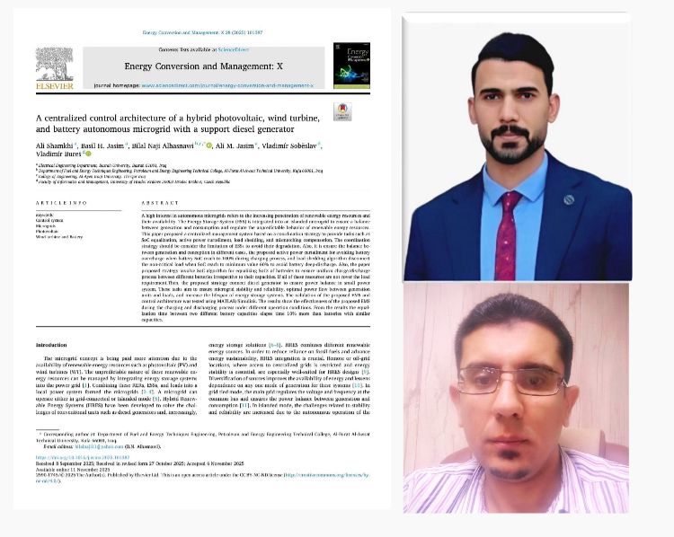 Assistant Lecturer Ali Shamkhi Hashim, Professor Dr. Basil Hani Jassim, and Dr. Ali Mohammed Jassim, faculty members in the Electrical Engineering Department at the College of Engineering, University of Basrah, published a joint research paper titled "Centralized Control System for a Hybrid Microgrid Composed of Photovoltaic Cells, Wind Turbines, and a Battery with Support from a Diesel Generator" in the international journal Energy Conversion and Management: X. The journal is indexed in Scopus in the first quartile (Q1).