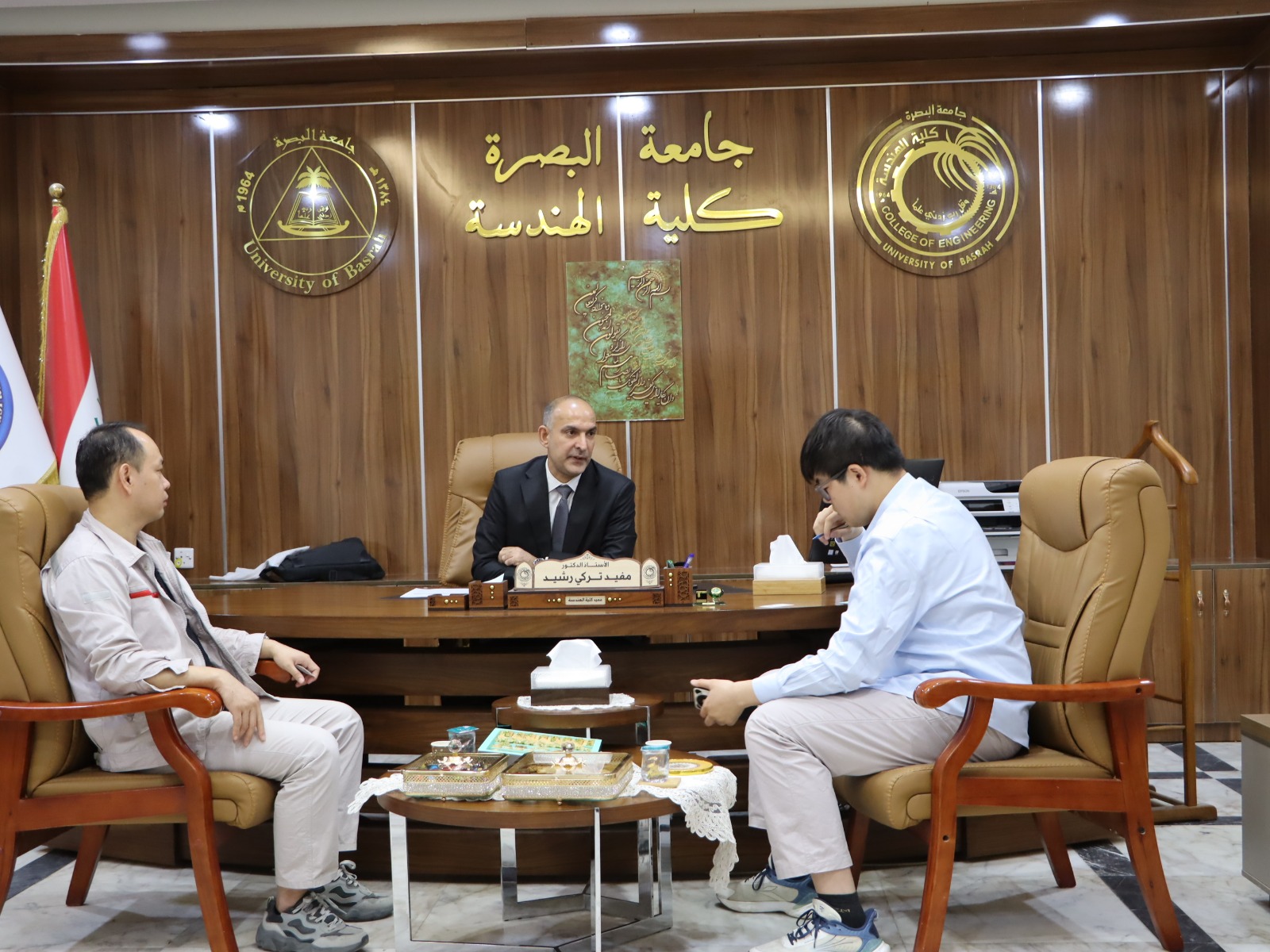 The Dean of the College of Engineering at the University of Basra, Professor Mufid Turki Rashid, received a delegation from China Energy. During the meeting, they discussed prospects for joint cooperation between the college and the company in the fields of engineering, science, and training. They also discussed ways to open channels of future communication to serve the academic and practical development of the college's students and graduates.
