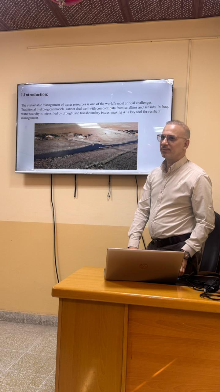 To keep pace with scientific and technological advancements, postgraduate students in the Civil Engineering Department, under the supervision of Professor Dr. Saleh Issa Khassaf, organized a seminar on "Applications of Artificial Intelligence in Hydraulic Structures and Water Resources." The lectures covered the following topics: