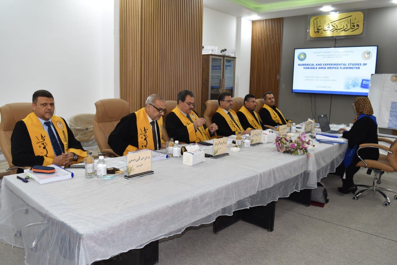 The Master's thesis of researcher Rana Karim Shamkhi was discussed in the Department of Mechanical Engineering, College of Engineering, University of Basrah, entitled Variable Orifice Flow Meter (VOFM) is an airflow sensor installed in a circular tube featuring a flexible flap fixed at one end and free to move at the other. These flow meters are widely used in mechanical ventilation systems. However, a detailed mathematical model and its numerical solution have not been adequately addressed in open literature. Therefore, this thesis focuses on developing and solving such a model. In addition, a physical prototype was constructed and experimentally tested. The resulting pressure differential induced by airflow inside the tube was measured and correlated with the actual flow rate.