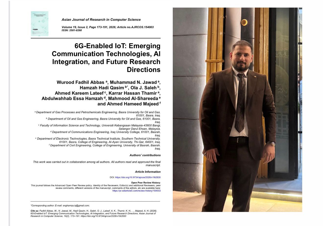 Assistant Lecturer Ahmed Hamid Majeed, a faculty member at the College of Engineering, University of Basrah, published a research paper in the Asian Journal of Computer Science Research entitled... 6G-Enabled IoT: Emerging Communication Technologies, AI Integration, and Future Research Directions