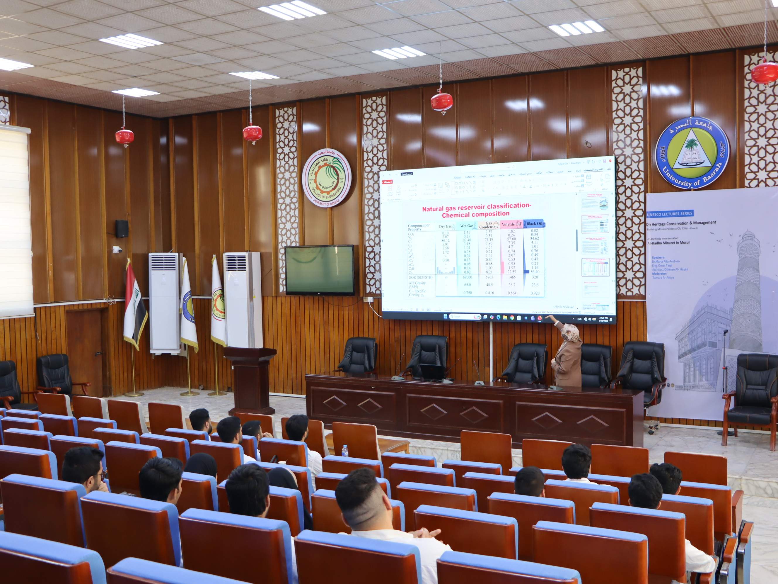 The first lecture of the course was presented by Assistant Lecturer Farah Nabil Abdul Razzaq, who discussed the basic stages of natural gas transfer from reservoirs to flaring systems, highlighting the technical and practical aspects of these processes.