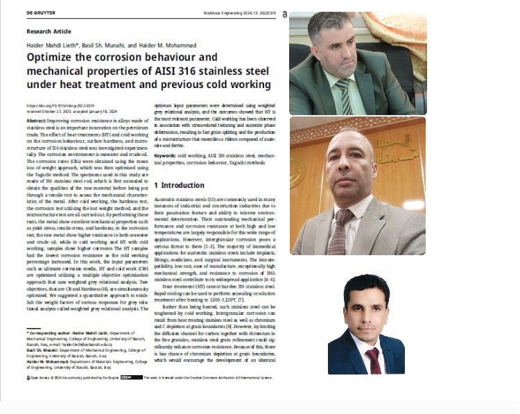 Dr. Haider Mahdi Layth, Dr. Basil Shaneen Manahi, and Dr. Haider Moaz Muhammad, teachers from the College of Engineering, University of Basra, published a joint research entitled Improving the corrosion behavior and mechanical properties of stainless steel AISI 316 under heat treatment and previous cold work. In the reputable German magazine Nonlinear Engineering Q2, which is one of the reputable international magazines, stainless steel is considered an important innovation in the field of petroleum in particular. The study of the effect of heat treatments (HT) and cold forming on corrosion behavior, surface hardness, and microstructure in a different corrosion environment, such as Seawater and crude oil. Corrosion rates (CRs) were obtained using a weight loss approach, Which was then improved using the Taguchi method. The specimens used in this study are made of 316 stainless steel bar, which was first annealed. The characteristics of the raw material were obtained before and examined through tensile testing to evaluate the mechanical properties of the metal. After cold forming, the hardness was tested, corrosion tested using the lost weight method, as well as All microstructure tests were performed. By performing these tests, the metal shows excellent mechanical properties such as yield stress, tensile stress, and hardness and also the raw metal showed higher corrosion resistance in seawater than crude oil, while in cold working and in-work thermal treatments, the samples show higher corrosion in treated samples. Thermal only.
